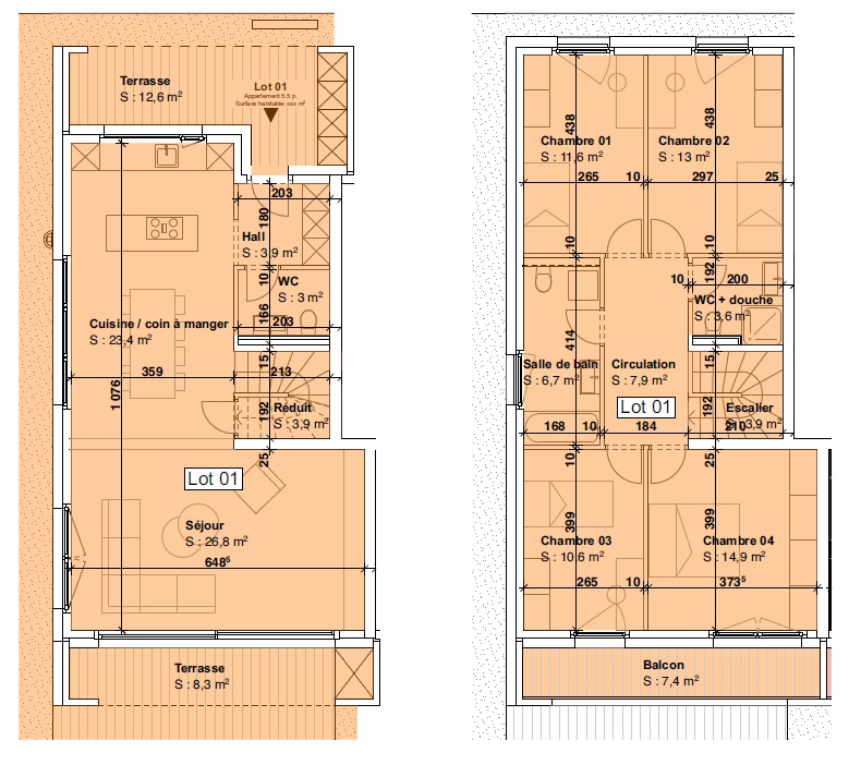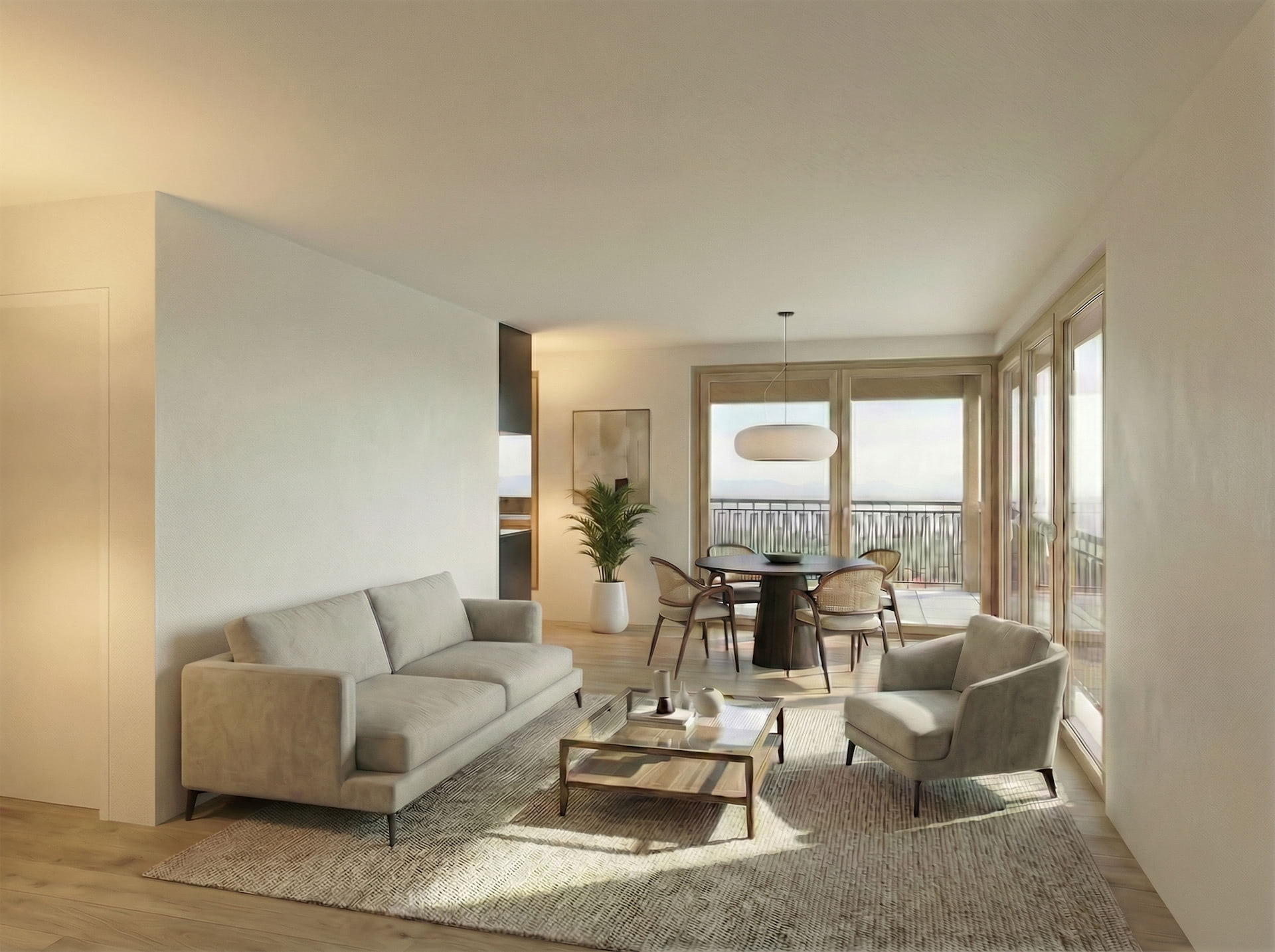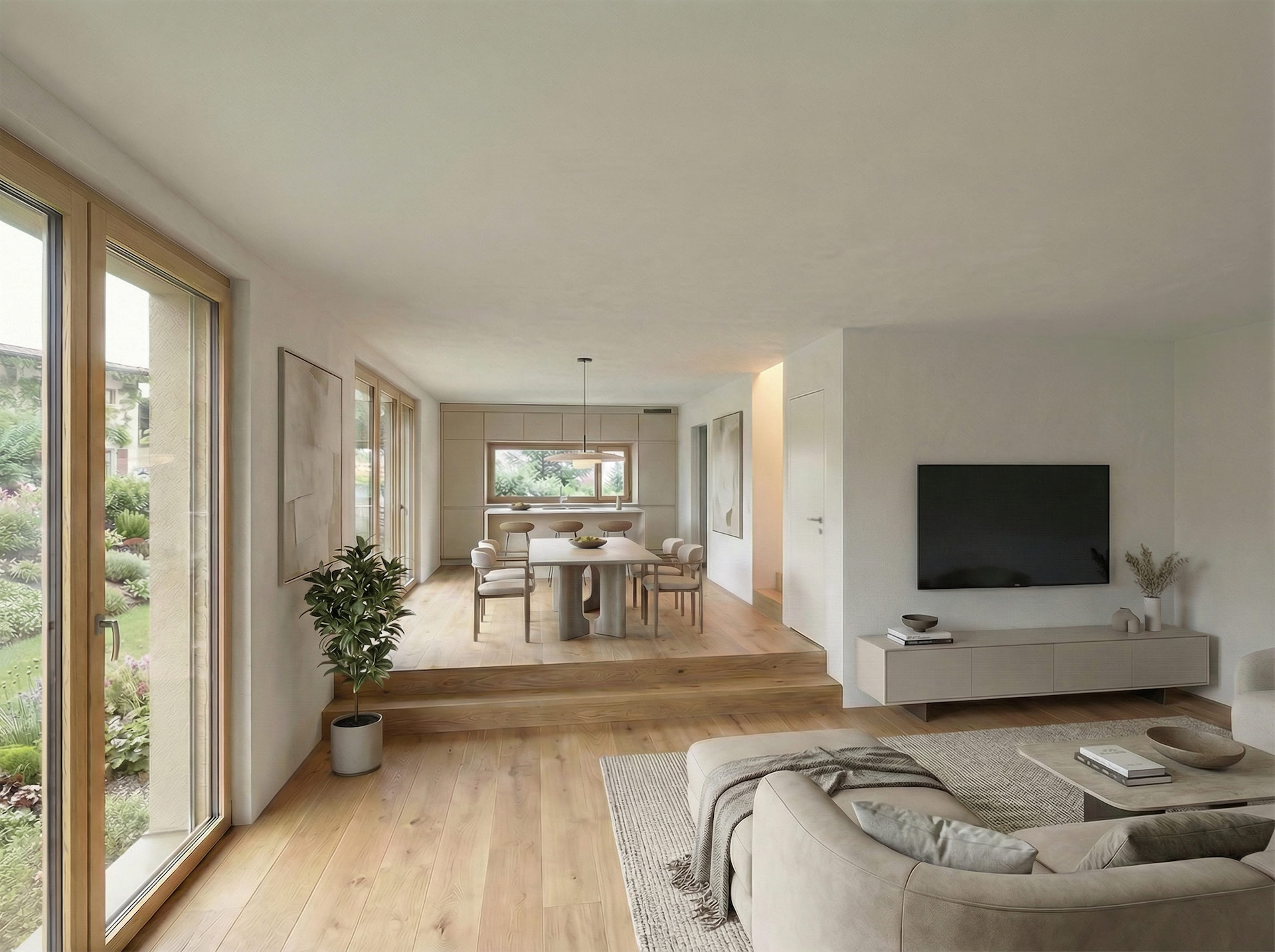 Les appartements de 5.5 pièces offrent un généreux espace de vie de plus de 50 m² au rez-de-chaussée, avec terrasse et jardin privatifs. L’étage accueille quatre chambres à coucher ainsi que deux salles d’eau, assurant confort et fonctionnalité pour tous.