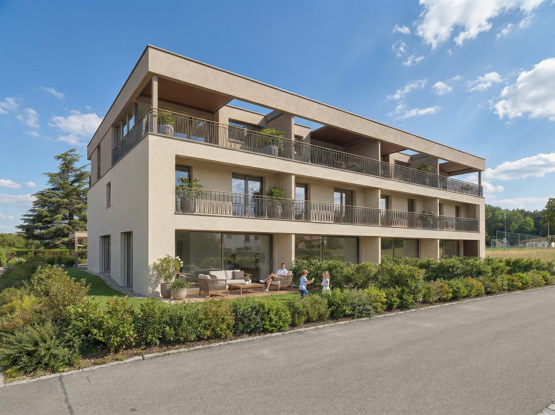La résidence se compose de 8 appartements, dont 4 logements de 2.5 pièces et 4 appartements de 5.5 pièces en duplex, et se distingue par son architecture contemporaine, la qualité de ses matériaux et sa belle luminosité naturelle.